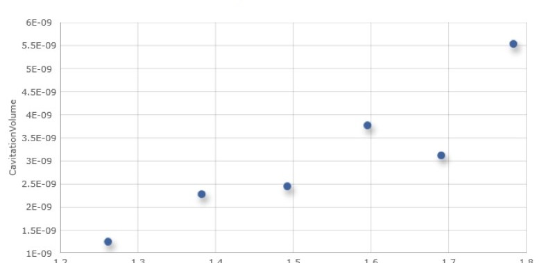 Conforme a pressão na entrada aumentava, a região de cavitação se expandia gradualmente mais a jusante de um Venturi cavitante. Além disso, observou-se um aumento na magnitude máxima da fração volumétrica de vapor.